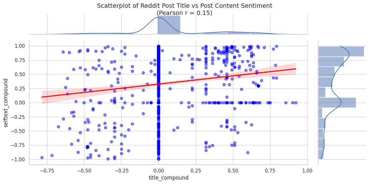 With the sentiment ready let’s take a look at how the title and selftext correlate.
