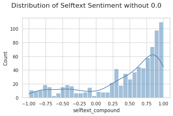 We’re now really seeing the effect of those 0.0 sentiment scores. The distribution behind them is skewed to the left and has zeros pulling the averages down. At this point, because the title doesn’t have a ton of context, and because of the 0 skewing, I decided to drop the 0.0 scores from continued analysis and just stick with the selftext sentiment.