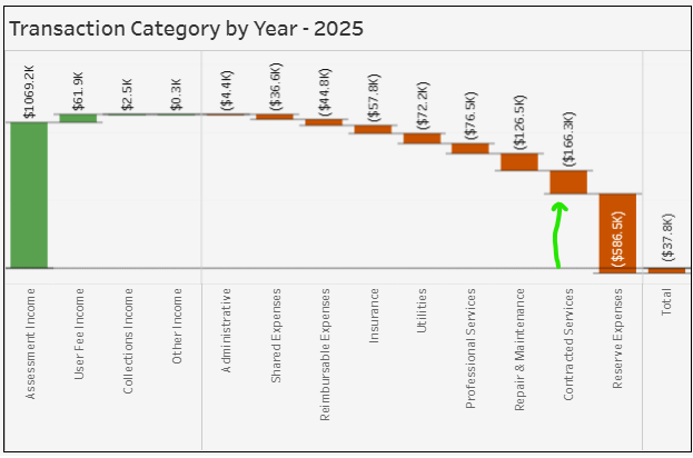 - The focus on category interaction - clicking on one of the categories in the expenses breakdown or transaction by category visuals updates the other charts. Here you can see that the majority of the reserve expense in 2025 was for necessary brick work in the HOA.