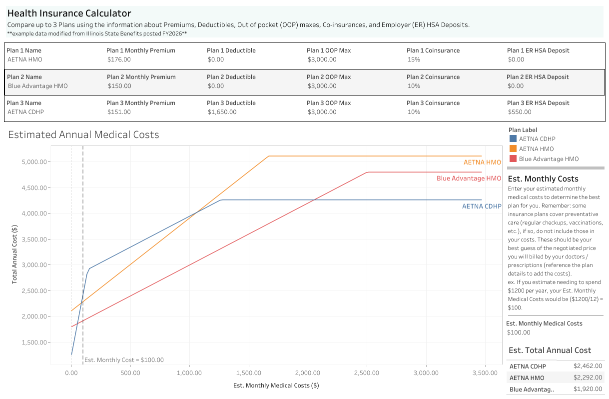 Then some plan costs - we’ll use some examples from the publicly accessible State Of Illinois - Deparment of Centra Management Services - Bureau of Benefits FY2026 documentation. PDF Link Here